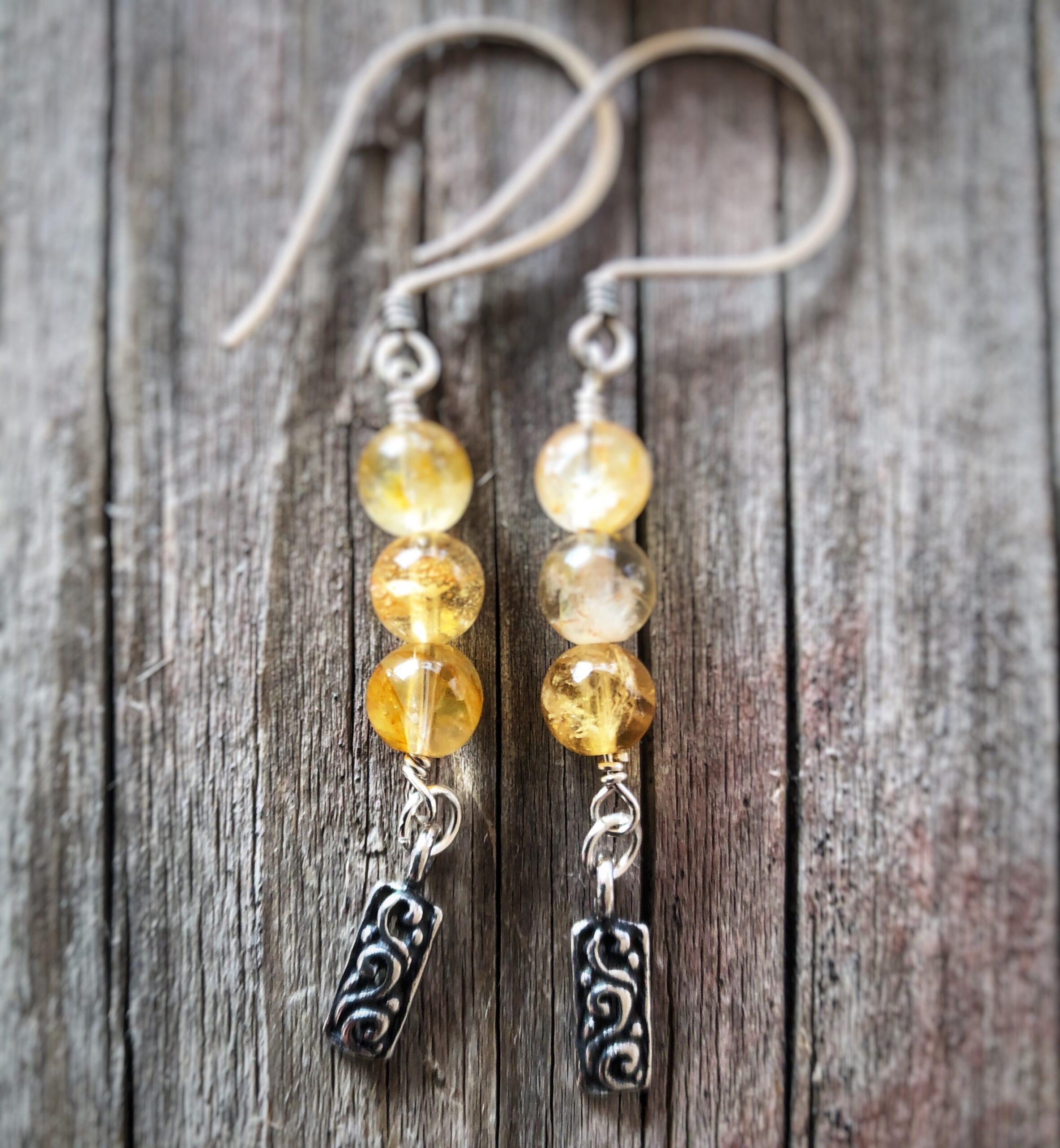 Örhängen med 3 runda golden healer, 6 mm i varje hänge. Lite större silver krokar och en dekorativ avslutning i traditionellt silverhantverk från Bali, Indonesien. Tot.6cm långa.